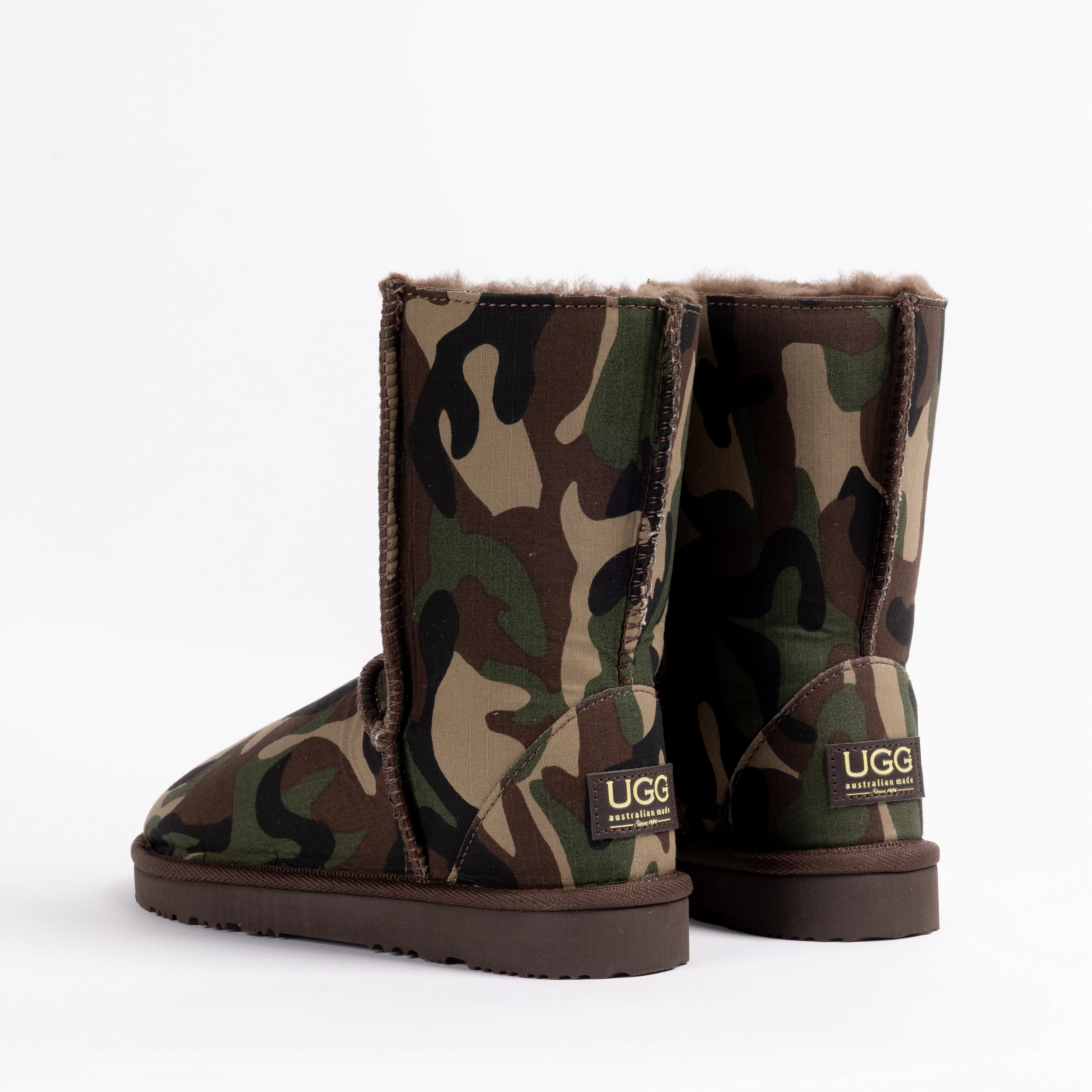 - Genuine military camouflage material bonded to sheepskin, colour and pattern may vary
